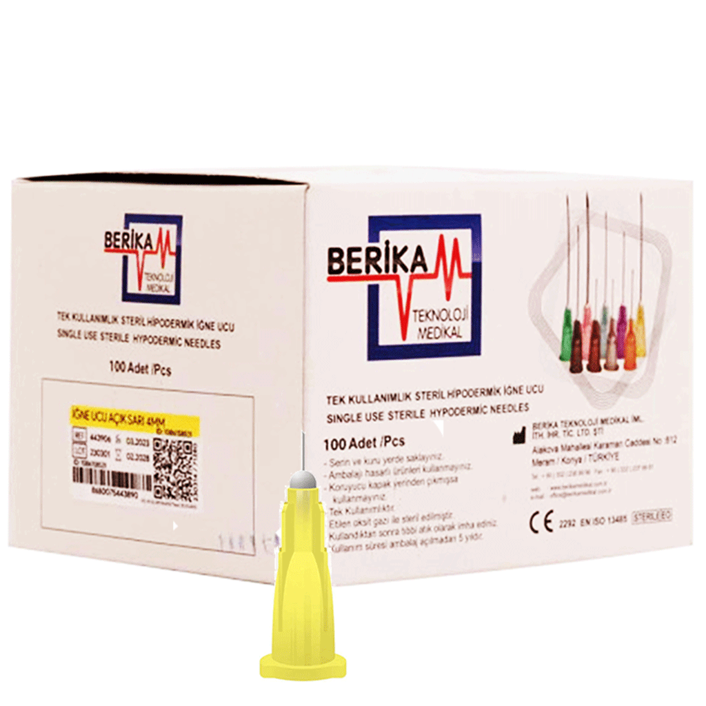 BERİKA MEZO 30G 4MM mezoterapi iğne ucu, yüz ve hassas bölgelerde mikro enjeksiyon için tasarlanmış ultra ince, steril ve tek kullanımlık bir medikal iğnedir. Luer lock/luer slip enjektörlerle uyumludur ve mezoterapi, PRP ve intradermal uygulamalar için idealdir.
