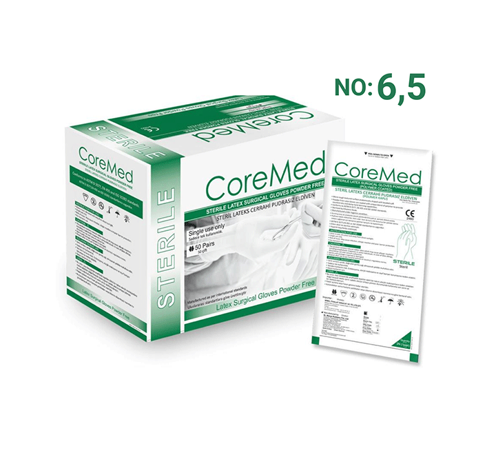 CoreMed 6.5 Numara Steril Cerrahi Eldiven, cerrahi müdahaleler ve tıbbi işlemler için özel olarak tasarlanmış, pudrasız ve lateks bazlı profesyonel eldivendir.